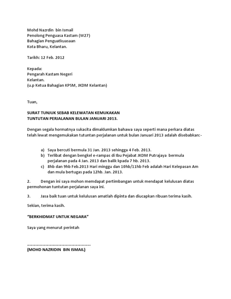 14 contoh surat lamaran kerja umum 2019 dan cara menulisnya. Surat ini sering digunakan jika anda mempunyai masalah seperti tidak hadir kerja atau lewat datang kerja. Saya dengan segala hormatnya, merujuk kepada perkara, saya <nama pekerja sebab kelewatan saya ialah kerana <sebab lewat datang kerja>. Surat tunjuk sebab lewat hantar tuntutan perjalanan sip. Surat tunjuk sebab adalah surat yang amat penting untuk ditulis selain surat rayuan.